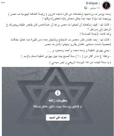 تداول مستخدمو منصات التواصل الاجتماعي من المصريين، مؤخرا، منشورا ينسب إلى رئيسة الطائفة اليهودية في مصر قولها إن "اليهود استخدموا أسماء إسلامية للتخفي داخل البلاد".