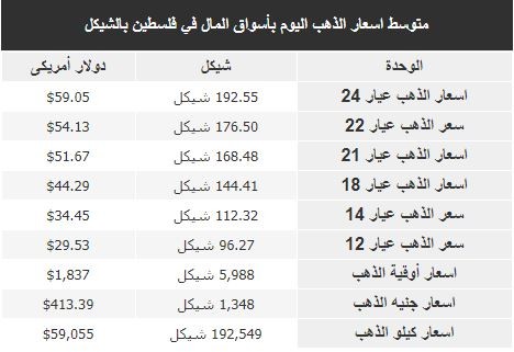 سُجلت أسعار الذهب في أسواق فلسطين، اليوم الثلاثاء، وفقًا للشيكل الإسرائيلي والدولار الأمريكي، على النحو التالي: