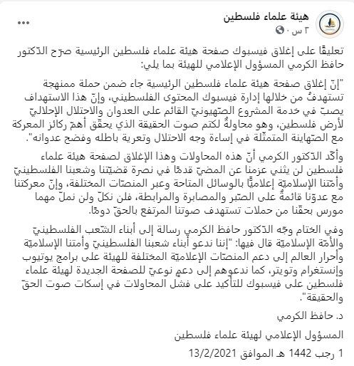 وأكد المسؤول الإعلامي لهيئة علماء فلسطين الدكتور حافظ الكرمي، أن هذه المحاولات وهذا الإغلاق لصفحة الهيئة، "لن يثني عزمنا عن المضي قدما في نصرة قضيتنا وشعبنا الفلسطيني وأمتنا الإسلامية إعلاميا، بالوسائل المتاحة وعبر المنصات المختلفة".