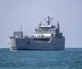 كما ظهر باب المروحية الخلفي مفتوحاً. مما يشير إلى أن طائرة ما أقلعت منه وبدت أن هناك سفينة إطفاء خلف الطراد تقوم برش زخات من الماء في الهواء.