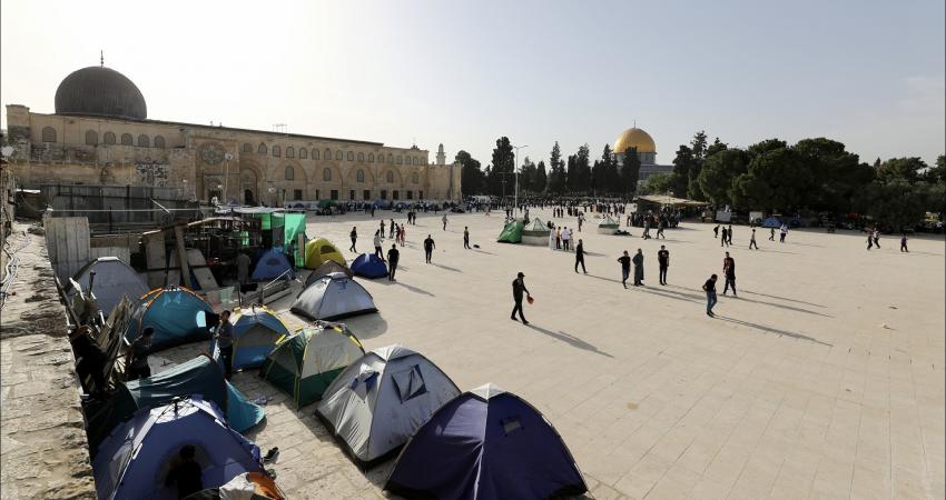 بجانب خيمتين نصبتا في إحدى زوايا المسجد الأقصى المبارك، يأخذ الشابان محمود وعلي ريان من الداخل المحتل قسطاً من الراحة بعد ليلة اعتكاف.