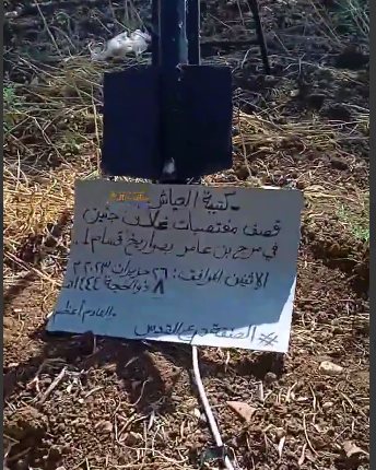 وكتب على هذه اللافتة: "قصف مغتصبات غلاف جنين في مرج ابن عامر بصواريخ قسام 1. الإثنين 26 حزيران/ يونيو 2023. الضفة درع القدس، القادم أعظم".