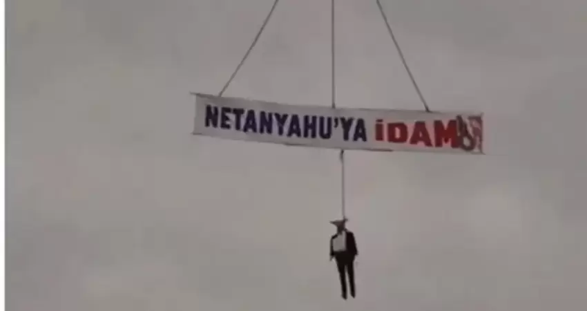 عُلقت دمية ضخمة تمثل رئيس حكومة الاحتلال الإسرائيلي بنيامين نتنياهو على رافعة في مدينة طرابزون بشرق تركيا، مع لوحة كتب عليها "حكم إعدام".