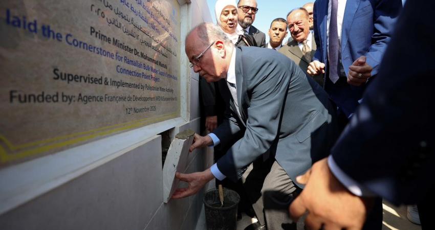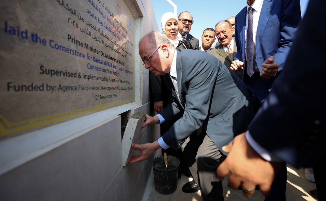وضع رئيس الوزراء محمد مصطفى، اليوم الأربعاء، حجر الأساس لمشروع نقاط الربط لنظام تزويد المياه بالجملة – نقطة ربط عابود، وهو أحد المشاريع الاستراتيجية الهادفة إلى تطوير قطاع المياه الفلسطيني وتعزيز الأمن المائي الوطني.