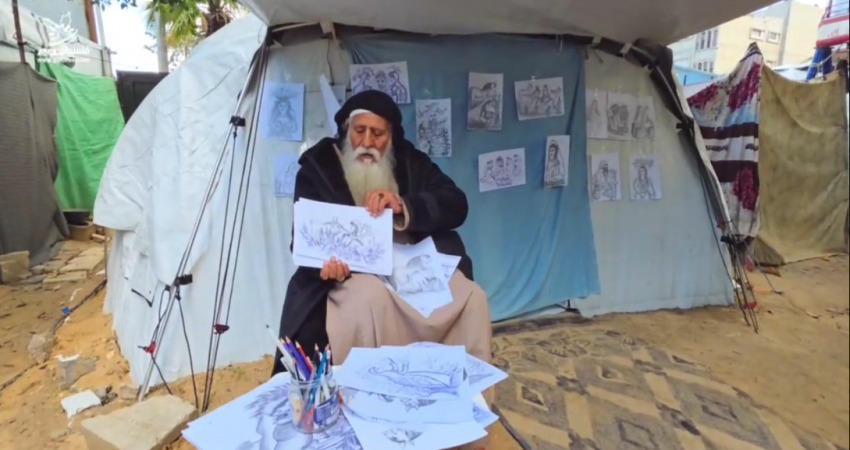 تحت سقف خيمة تهزها ريح الشتاء في قطاع غزة، لا يجلس الحاج السبعيني محمد زملط لانتظار المساعدات فحسب، بل يجلس ليمارس طقساً من نوع خاص؛ طقس الاستحضار. في يده ريشة متآكلة، وأمامه بضع أوراق استقرضها من أحفاده الجوعى، وفي قلبه ثقب بحجم "الخليل" و"غزة" معاً.