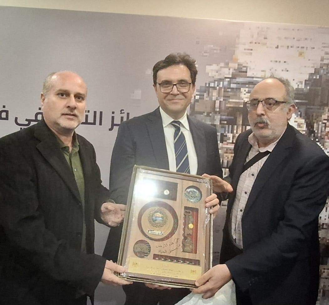 وكرم أبو النصر، السفير اللوح في مكتبه على جهوده لتخفيف المعاناة عن أبناء شعبنا.