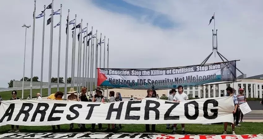 تظاهر مئات الأشخاص أمام مبنى البرلمان الأسترالي في العاصمة كانبرا احتجاجا على زيارة رئيس دولة الاحتلال الإسرائيلي إسحاق هرتسوغ إلى البلاد.