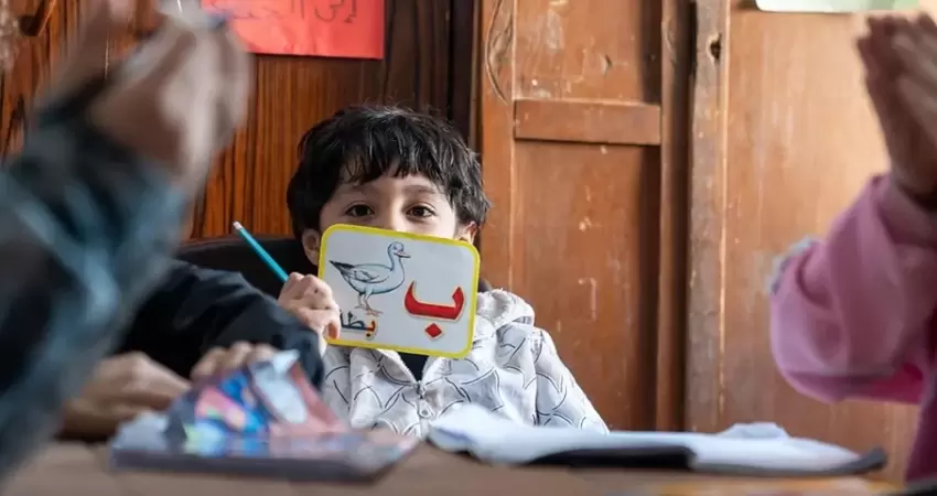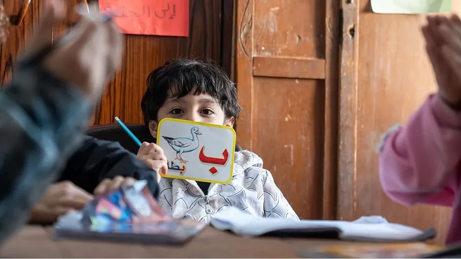 وجاء في التقرير الذي أعده ديفيد م. هالفينجر وبلال شبير إنه في وسط مخيم مكتظ بالنازحين الفلسطينيين جنوب غزة، تبرز بوابة عليها ملصق لافت للنظر لسيارة سباق كرتونية حمراء زاهية. وفي الداخل، يزدان ممر يؤدي إلى مجمعٍ من الخيام الدراسية برسومات للأطفال تعكس واقع الحياة.
