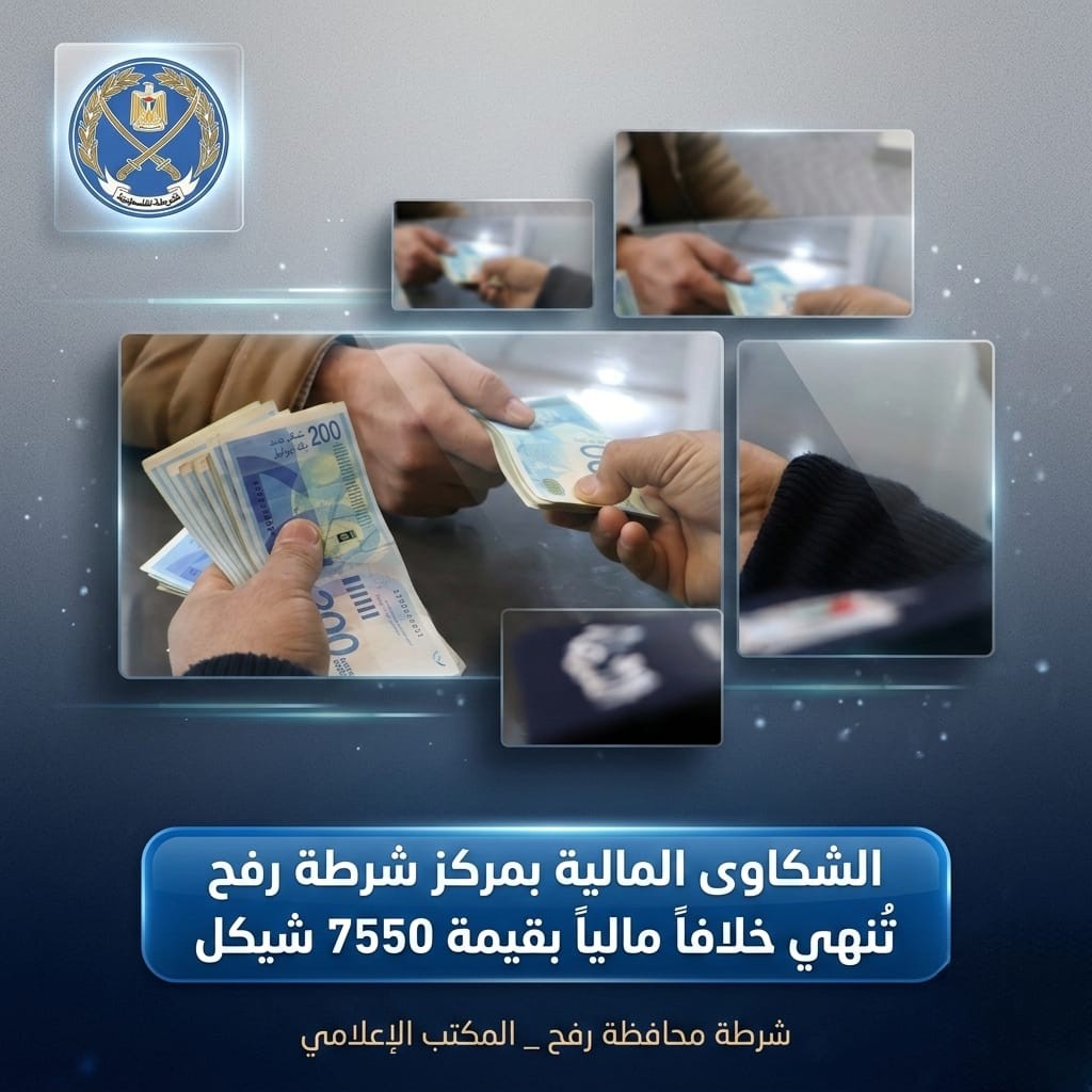 الشكاوى المالية بمركز شرطة رفح تُنهي خلافاً مالياً بقيمة 7550 شيكل