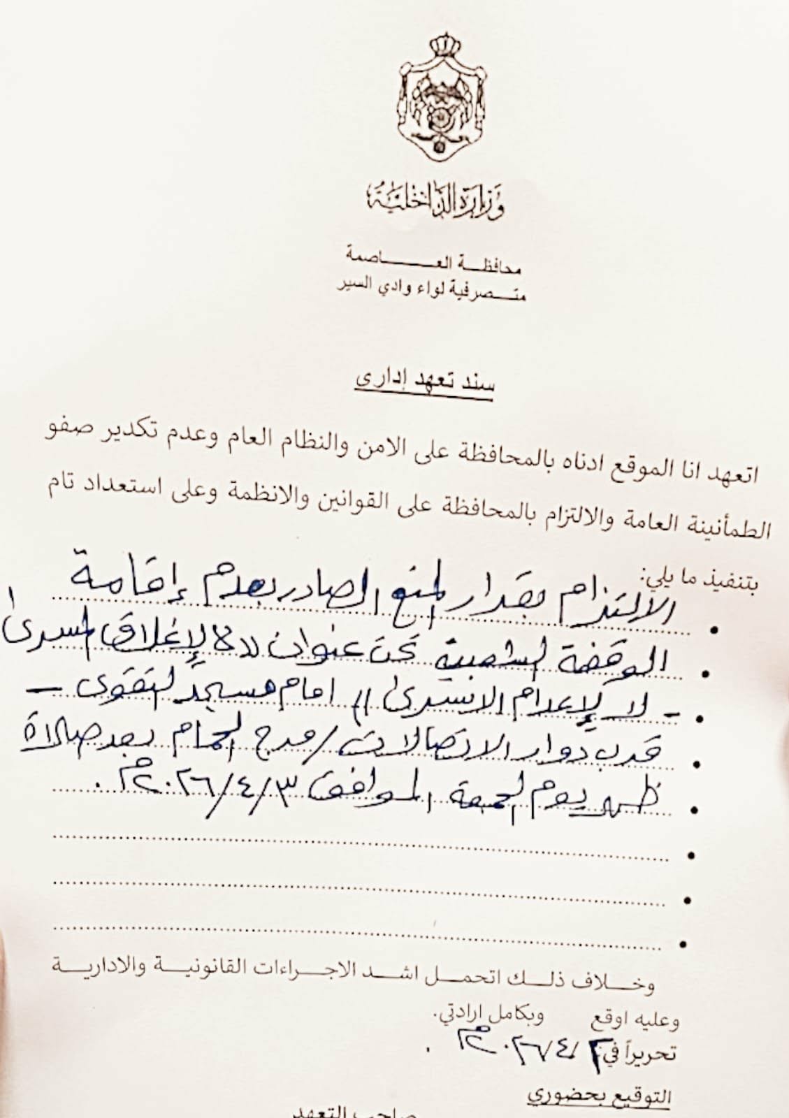 ويعبّر الحزب عن استغرابه الشديد من قيام الحكام الإداريين في عدد من المحافظات باستدعاء رؤساء فروعه وإجبارهم على توقيع تعهدات بعدم إقامة أي فعاليات، حتى أمام مقرات عدد من فروع الحزب، في خطوة تعكس تضييقًا غير مبرر على الحريات العامة، رغم أن هذه الوقفات تمثل صوت الشارع الأردني الحيّ ورفضه القاطع لما يتعرض له المسجد الأقصى من إغلاق واعتداءات متواصلة، تمس بشكل مباشر الوصاية الأردنية على المقدسات الإسلامية والمسيحية في القدس، والتي تُعدّ من ثوابت الدولة الأردنية ومصدر إجماع وطني.
