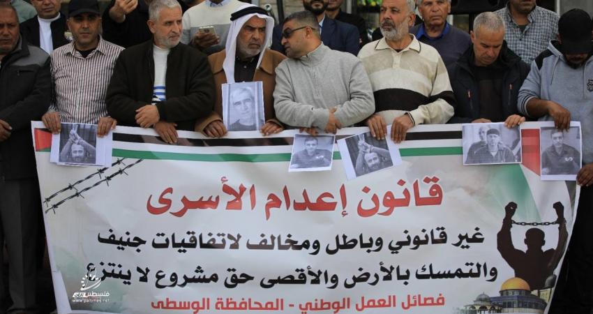 نظمت فصائل العمل الوطني والإسلامي في المحافظة الوسطى بقطاع غزة، اليوم السبت، وقفة جماهيرية حاشدة تنديداً بمصادقة كنيست الاحتلال الصهيوني على "قانون إعدام الأسرى"، بمشاركة واسعة من ممثلي القوى الوطنية ومحررين وعائلات أسرى.