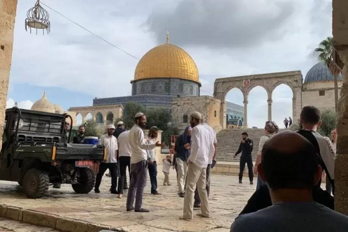 وأدى مستوطنون ما تسمى طقوس الصباح، ورددوا دعوات تحريضية على المسجد الأقصى، خلال اقتحامهم المنطقة المقابلة لمسجد قبة الصخرة.
