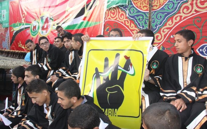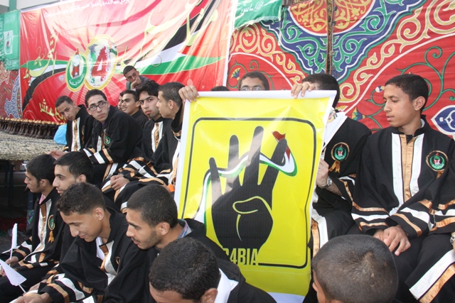 نظمت الكتلة الإسلامية الإطار الطلابي لحركة المقاومة الإسلامية حماس مهرجاناً تكريمياً للطلاب المتفوقين في نتائج الثانوية العامة عصر الثلاثاء بمدينة رفح في مدرسة القدس الثانوية للبنات وسط المدينة. وكرمت الكتلة خلال مهرجانها الرابع عشر للتفوق " مشاعل التحرير " 100 طالباً متفوقاً من الفرعين العلمي والأدبي بحضور عدد من الشخصيات الاعتبارية في مديرية التربية والتعليم. وقال غازي حمد خلال كلمة حركة حماس في المهرجان: "إن هؤلاء الذين قاموا بهذا النجاح والتفوق ضربوا نموذجا عظيما في طموحهم وآمالهم", مؤكداً أنهم في خضم الصعوبات والحصار والآلام والأحزان "أدخلوا الفرحة في قلوبنا ورسموا الابتسامة على شفاهنا وشفاه آبائنا وأمهاتنا". واعتبر حمد أن هذه من اللحظات العظيمة التي نفتخر بها بهؤلاء الذين يرسمون صورة جميلة لفلسطين. وأضاف:"نحن في حركة حماس سعداء بكم وفخورون بكم ونحملكم معنا مسؤولية الوطن والحفاظ على القدس والمقدسات, وكلي ثقة بكم أنكم من ستحملون مشاعل التحرير". هذا ولم يغب مشهد مصر وأحداثها عن الحفل، حيث رفع الطلاب المتفوقون صورة لشعار رابعة العدوية خلال المهرجان تضامناً مع شعب مصر, وقُرأت الفاتحة على أرواح شهداء مصر. وقال حمد:" إن مصر العظيمة تعاني اليوم ممن يريدون أن يغرقوها في الدم والقهر والظلم والاستبداد" مؤكداً أننا "أصحاب ثقة عظيمة بأن الشعب المصري شعب مؤمن مسلم لا يمكن أن يرضى بالظلم ". وتابع:" القتل والعسكر والدماء لن يثني إرادة الشعوب". وتخلل المهرجان العديد من الفقرات الانشادية والتكريمية كرمت خلاله الكتلة مديرية تعليم رفح والشرطة الفلسطينية ونقابة المعلمين ومدراء المدارس الثانوية. [img=082013/view_1377073837.jpg]جانب من حفل التكريم [/img] [img=082013/view_1377073908.jpg]جانب من حفل التكريم [/img] [img=082013/view_1377073957.jpg]جانب من حفل التكريم [/img] [img=082013/view_1377074020.jpg]جانب من حفل التكريم [/img] [img=082013/view_1377074118.jpg]جانب من حفل التكريم [/img] [img=082013/view_1377074360.jpg]جانب من حفل التكريم [/img] بالصور: "الكتلة"تكرم متفوقي التوجيهي برفح بالصور: "الكتلة"تكرم متفوقي التوجيهي برفح بالصور: "الكتلة"تكرم متفوقي التوجيهي برفح بالصور: "الكتلة"تكرم متفوقي التوجيهي برفح بالصور: "الكتلة"تكرم متفوقي التوجيهي برفح بالصور: "الكتلة"تكرم متفوقي التوجيهي برفح