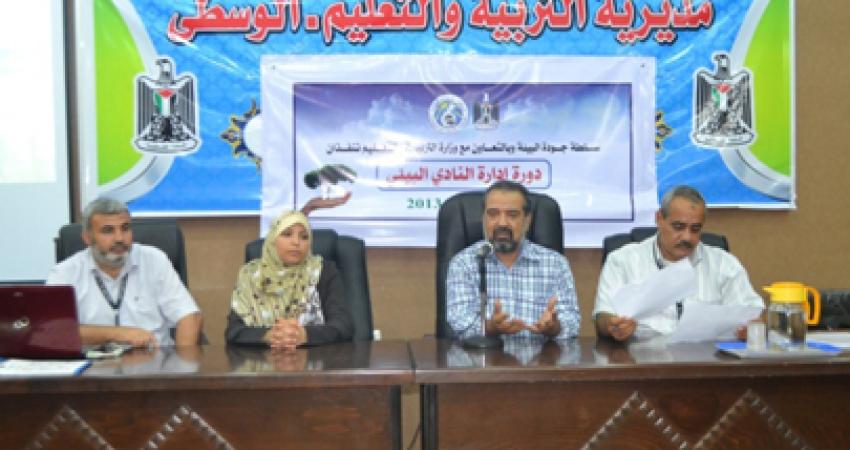 افتتحت مديرية التربية والتعليم بالوسطى دورة في إدارة النادي البيئي، بالتعاون مع سلطة جودة البيئة الفلسطينية، بحضور النائب الفني لمديرية الوسطى ماهر أبو زر، والمهندسة رنا دعيس من سلطة جودة البيئة، ورئيس قسم الصحة المدرسية محمود العزازي، ورئيس قسم العلاقات العامة أحمد دلول، ورئيس شعبة الصحة المدرسية عصمت بشير، وذلك بقاعة الاجتماعات بمركز التدريب التربوي. وخلال افتتاح الدورة رحب أبو زر بالحضور وتحدث عن أهمية النادي البيئي ودوره داخل المدرسة، وأوضح أن مديرية التربية والتعليم بالوسطى تهتم بصورة كبيرة بالبيئة المدرسية التي تشكل جزء أساسي من صحة ونمو أبنائنا الطلبة. وأضاف أبو زر أن البيئة أصبحت من المجالات المهمة خاصة في الدول المتقدمة حيث تحتل البيئة والاهتمام بها مكانة رفيعة، ونحن المسلمين أولى بالاهتمام بالبيئة لان الدين الإسلامي يحث على الاهتمام بالبيئة والنظافة والصحة. من جانبه أوضح العزازي أن الهدف من هذه الدورة هو تفعيل النادي البيئي في المدارس بشكل عملي، وتفعيل وتنفيذ المشاريع البيئية، وأضاف العزازي انه سيتم من خلال هذه الدورة توضيح آليات تنفيذ المشاريع البيئية والصحية، وتم خلال اللقاء مناقشة أهم المشكلات البيئية كالتلوث والنفايات والتصحر والكوارث الطبيعية. وبين العزازي أن أهم أهداف النادي البيئي هي حث الطلبة على الالتزام بالآداب الإسلامية في تعاملهم مع البيئة، والكشف عن بعض المشكلات البيئية المحلية، ورصد السلوك الخاطئ الذي يسبب مشاكل بيئية، بالإضافة إلى تنمية الوعي البيئي في المدارس وتفعيل دور الطلاب في حل المشاكل البيئية. وتم خلال الدورة طرح عدد من المشاريع البيئية لطلبة المدارس وهي حساب كميات الماء والكهرباء المهدرة في المدرسة، وحملات تنظيف للمدرسة ومحيطها، وإعداد خطة لتحسين البيئة في المدرسة والحي.