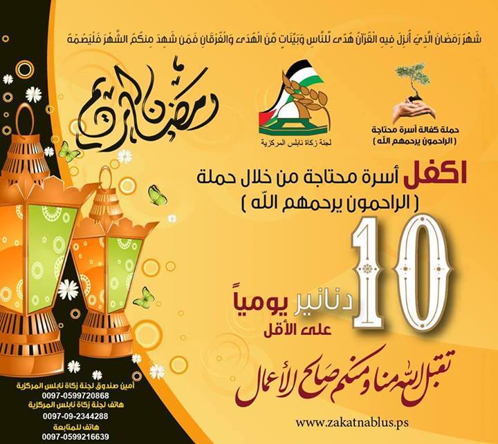اطلقت لجنة زكاة نابلس المركزية حملة رمضانية تحت عنوان "الراحمون يرحمهم الله" لكفالة الأسر الفقيرة والمحتاجة في شهر رمضان. وقال نائب رئيس اللجنة الشيخ أحمد شرف لـ[color=red]"فلسطين الآن" [/color]إن اللجنة ترعى أكثر من (2500) أسرة، لذا فالحملة تهدف لسد احتياج هذه العائلات في الشهر الفضيل". وتابع "كفالة الأسرة يوميًا عشرة دنانير فقط، أي خمسون شيكلًا، وهو مبلغ بسيط لا يشكل عبئًا على الكافل، فكما قال النبي محمد صل الله عليه وسلم: "قليل دائم خير من كثير منقطع". ولفت شرف إلى أن "اللجنة عقدت اجتماعًا مع الأئمة وخطباء المحافظة بإشراف مديرية الأوقاف للتواصل معهم في إنجاح الحملة، كما جرى إعداد استمارة طلب كفالة أسرة فقيرة نوضح فيها تفاصيل الحملة والمعلومات الشخصية عن الكافل". ومن الخطوات لانطلاق الحملة كان الاجتماع مع بعض الجمعيات الإنسانية في محافظة نابلس للمشاركة في توزيع الاستمارة على المنازل والمتاجر وشرح تفاصيل الحملة، وكذلك جرى إعداد تقويم لشهر رمضان يحمل شعار الحملة بالإضافة إلى ثلاثين سؤالًا فقهيا تتعلق بأحكام الزكاة والإجابة عنها. وأشار إلى تنفيذ مجموعة من التصاميم عن الحملة ونشرها عبر مواقع التواصل الاجتماعي بعبارات مختلفة، لحض الناس على إنجاح الحملة، ووضع يافطات ولافتات في شوارع الرئيسة. ومن المخطط له –بحسب نائب رئيس اللجنة- زيارة العديد من المؤسسات التجارية في مدينتنا لإيجاد كفالات للأسر الفقيرة، وتنفيذ أمسيات رمضانية للحديث عن الحملة.