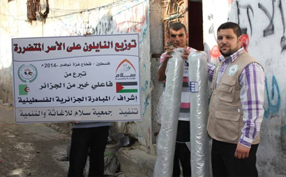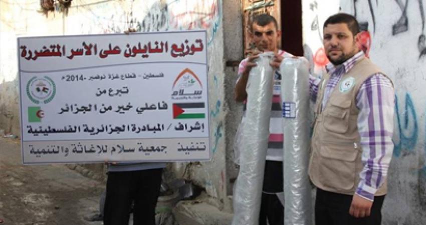 أنهت جمعية سلام للإغاثة والتنمية بغزة تنفيذ مشروع توزيع النايلون على الأسر الفقيرة والمتضررة وذلك بدعم كريم من المبادرة الجزائرية الفلسطينية. وأشار يعقوب سليمان رئيس جمعية سلام للإغاثة والتنمية ان الجمعية قامت بتنفيذ مشروع توزيع النايلون على الأسر الفقيرة والمتضررة لتقيهم من برد الشتاء القارص، حيثُ تم توزيع النيلون لتغطية البيوت التي أسقفها عبارة عن ألواح الإسبست والتي تضررت بفعل العدوان الإسرائيلي الأخير على القطاع. وأردف سليمان ان توزيع النايلون يأتي في ظل الأوضاع الصعبة التي يعيشها ابناء شعبنا من جراء العدوان الصهيوني الأخير على قطاع غزة وتشديد إجراءات الحصار. وشكر سليمان المبادرة الجزائرية الفلسطينية ممثلة برئيسها أبوأسامة الجزائري على دعمهم وجهودهم التي تساهم في التخفيف من معاناة المواطنين في ظل الحصار الخانق على القطاع. وقد استفاد من مشروع النايلون العديد من الأسر والعائلات الفقيرة والمتضررة. يُشار ان المبادرة الجزائرية الفلسطينية قامت بتنفيذ العديد من المشاريع الاغاثية والتنموية في قطاع غزة.