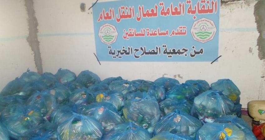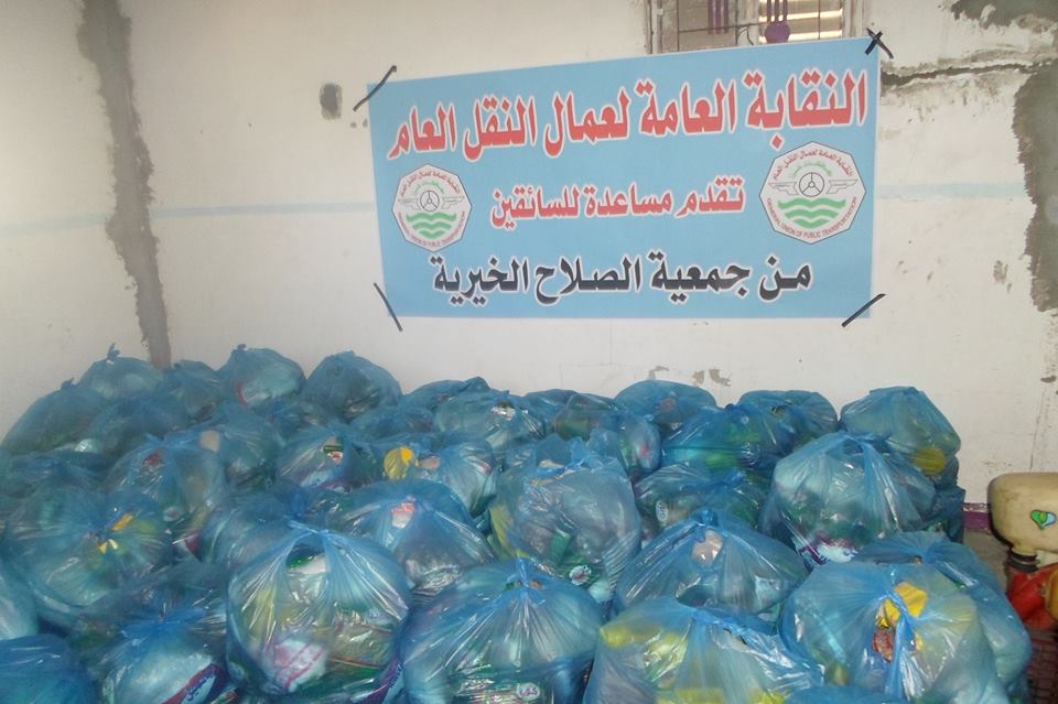 وزعت النقابة العامة لعمال النقل العام الأربعاء (12-11)، طرودًا غذائية على عشرات السائقين مقدمة من جمعية الصلاح الخيرية، وذلك في إطار التعاون المستمر بين الجانبين في تقديم المساعدات للسائقين. وكان رئيس نقابة عمال النقل جمال جراد اجتمع مع رئيس جمعية الصلاح الخيرية أحمد الكرد وبحثا التعاون المشترك بينهما. وقال جراد:" إن الأزمات المتعددة التي مازالت تعصف بقطاع غزة نتج عنها تفاقم أوضاع السائقين المعيشية إلى حد فاق كل التوقعات والأرقام". وفيما يتعلق بآثارها على قطاع النقل العام، كشف عن إصابة كافة قطاعات النقل والمواصلات الاقتصادية بشلل تام، موضحاً أنها أثرت بشكل مباشر على العاملين في مجال النقل من سائقين وتجار وأصحاب ورش صيانة للمركبات والعاملين في الصيد البحري. وأشاد جراد بصمود السائقين وتحملهم للمشاق والمتاعب الكبيرة التي سببها الحصار وعدوان الاحتلال الإسرائيلي الأخير على القطاع.