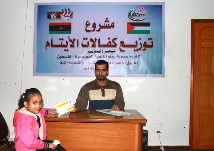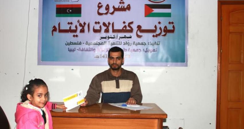 شرعت جمعية روّاد للتنمية المجتمعية أمس بتوزيع الكفالات الشهرية على الأيتام المكفولين لديها وذلك عن شهر أكتوبر للعام الجاري، وذلك بتمويل كريم من جمعية طرابلس للإغاثة والثقافة بجمهورية ليبيا الشقيقة. وأفاد الأستاذ رباح بخيت رئيس الجمعية أنه تم توزيع الكفالات الشهرية بواقع 85 دولار لكل يتيم، حيث تستمر الكفالة طيلة عام 2014م، موضحاً أن عدد الأيتام المستفيدين من المساعدات التي قدمتها جمعية طرابلس الليبية بلغت 42 يتيماً. وبين بخيت أن جمعيته ستستمر في توزيع المساعدات النقدية والعينية على الأيتام والمعوزين من أجل خدمة أوسع شريحة من الأيتام لا سميا بعد الحرب الشرسة التي تعرض لها القطاع والتي نتج عنها وجود عدد كبير من الأطفال الذين فقدوا معيلهم، حيث تعمل الجمعية في هذه الأوقات على جلب الدعم وتوفير الكفالات الشهرية لهؤلاء الأطفال الذين أصبحوا أيتام بعد فقدهم لآبائهم. من جانبه أوضح المهندس محمد أبو سيدو مدير الجمعية أنها حملت على عاتقها بذل أقصى طاقتها وجهدها في سبيل التخفيف من معاناة الأيتام، في ظل الظروف الصعبة التي يعيشها أهل غزة، لاسيما بعد الحرب الأخيرة على القطاع، وأكد أن هذه الكفالة تأتي تماشياً مع أهداف الجمعية ورسالتها الإنسانية السامية تجاه تلك الأسر للتخفيف عن كاهلها في ضوء تردي الأوضاع المعيشية والاقتصادية. كما وتقدم الأطفال الأيتام وذويهم بكامل الشكر والعرفان من جمعية طرابلس للإغاثة والثقافة في دولة ليبيا الشقيقة وجمعية روّاد، والذين يواصلون مد يد العون والمساعدة والكفالات الشهرية لأسر الأيتام والشهداء من أبناء الشعب الفلسطيني.