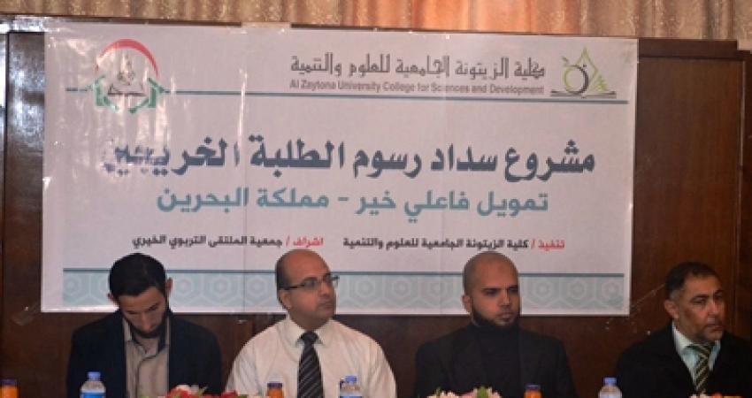 احتفلت جمعية الملتقى التربوي باختتام مشروع سداد رسوم مجموعة من الطلبة الخريجين من ذوي الوضع الاقتصادي المتردي، وذلك بتمويل فاعلي خير من مملكة البحرين وبالتعاون مع كلية الزيتونة للعلوم والتنمية. حيث انطلق الاحتفال بحضور اسماعيل الدعالسة رئيس قسم شئون الطلبة، وهيثم حمد رئيس قسم الشئون الادارية بالكلية ، ومحمد بارود مدير برنامج رعاية الطالب، وعطية جودة مدير دائرة المشاريع بالجمعية، والطلبة المستفيدين من المنحة. وفي بداية الاحتفال رحب اسماعيل الدعالسة بالحضور، وثمن كافة الجهود التي تعنى بمساعدة الطلبة الخريجين على إكمال متطلبات وإجراءات تخرجهم، خاصة لأولئك الذين يعانون من أوضاع اقتصادية صعبة ويعجزون عن تسديد الرسوم الدراسية المستحقة عليهم، معبرا عن تقديره الكبير لفاعلي الخير من مملكة البحرين ولجمعية الملتقى التربوي على تعاونهم مع الكلية وتنفيذهم لهذا المشروع الإنساني المتميز. من جانبه هنأ عطية جودة الطلبة لاستفادتهم من المشروع، وتمنى أن تكون هذه الخطوة دافعا لهم في المجتمع لينطلقوا بكل قوة إلى مؤسسات المجتمع بحثا عن فرصة العمل التي تمكنهم من تحقيق ذاتهم، معربا عن سعادته بالتعاون والعمل المشترك مع كلية الزيتونة.