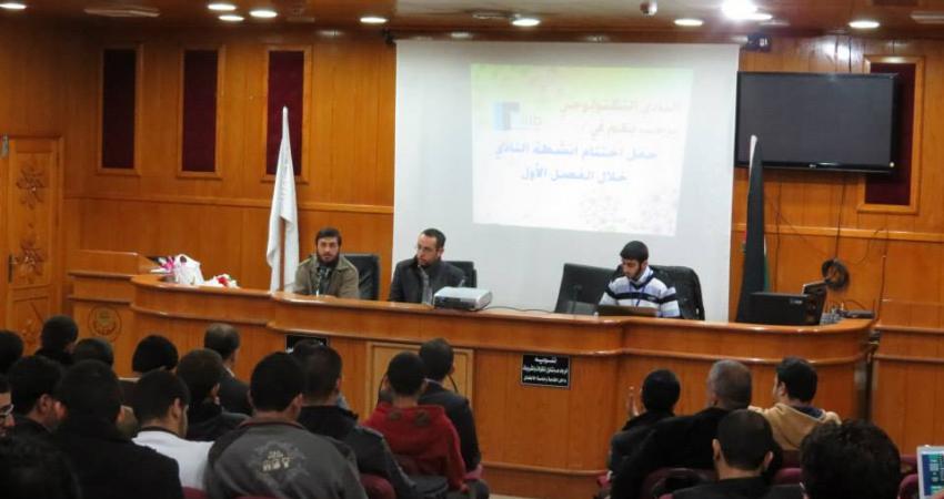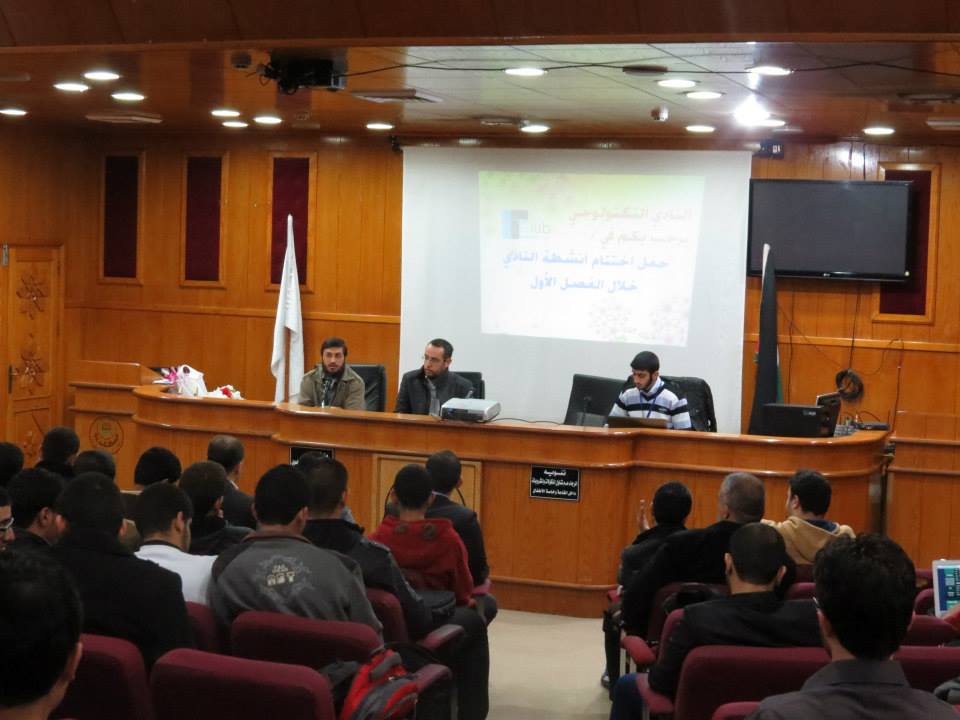 اختتم النادي التكنولوجي في مجلس طلاب وطالبات الجامعة الإسلامية أنشطته وفعالياته التي عقدها خلال الفصل الدراسي الأول، وسط حضور أكاديمي من كلية تكنولوجيا المعلومات، و مشاركة كبيرة من الطلاب والطالبات. وأكد الطالب معاذ رجب رئيس النادي التكنولوجي، بأن ناديه عقد العديد من الفعاليات والأنشطة التي تخدم شريحة الطلاب وخصوصا طلاب كلية التكنولوجيا. ويقدم النادي خدمات وفعاليات للطلاب كان أهمها تكريم طلبة الامتياز وتنظيم حفل استقبال للطلبة الجدد وورشات عمل تتحدث عن كيفية تطوير خدمة الطلاب تكنولوجيا وإعلامياً، حسب ما أفاد رجب. وأضاف بأن النادي يتلمس احتياجات الطلبة ويساعد بكل ما أوتي من جهد لتلبيتها وتنفيذها. من جانبه أكد المحاضر رائد رشيد رئيس قسم الوسائط المتعددة وتطوير الويب، على أهمية وجود النادي الطلابي الذي يهتم بشكل خاص بطلاب الكلية ويخدمهم وينفذ الأنشطة اللامنهجية التي تساعد في إثراء المواد الجامعية بالأنشطة العملية والتطبيقية. ودعا القائمين على النادي بتكثيف أنشطته وفعالياته التي تواكب التقدم والتطور التكنولوجي واحتياجات الطلاب .كما وحث الطلاب على الجد والاجتهاد والمزيد من المثابرة للاختبارات النهائية الفصلية . وتخلل الحفل على عرض فيديو تضمن أنشطة النادي خلال الفصل الأول , وتوزيع شهادات الدورات التدريبية التي تم عقدها في الفصل وتكريم المدربين وعمادة الكلية يشار إلى أنّ النادي التكنولوجي في الجامعة الإسلامية هو من أهم الأندية الطلابية التي تُولي اهتمام كبير لخدمة طلاب الكلية.
