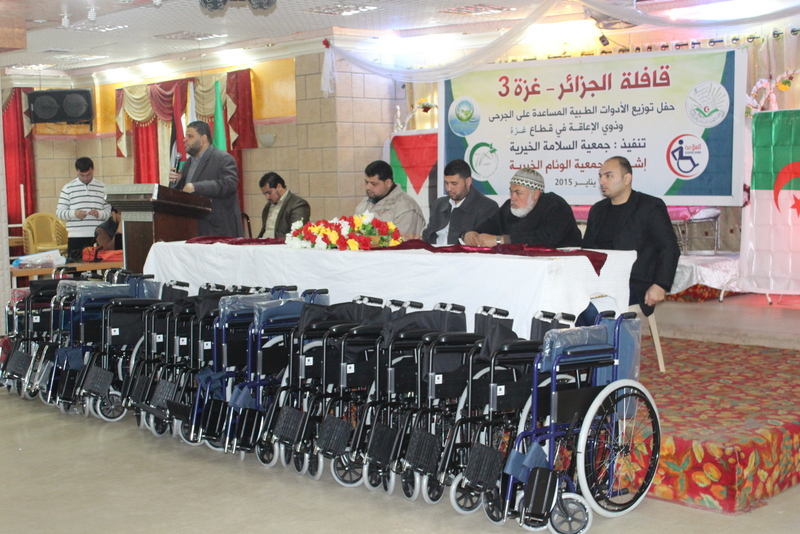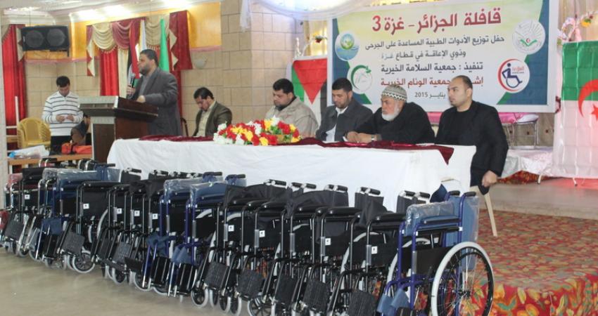 قدمت جمعية السلامة 100 كرسي متحرك للجرحى ولذوي الإعاقة في قطاع غزة، برعاية من جمعية الوئام الخيرية. وأكد عضو مجلس إدارة جمعية السلامة وائل فرج أن الجرحى وذوي الإعاقة يعانون من نقص في الأدوات المساعدة والأدوية، مبينا أن جمعيتهم تعمل على توفير ما تستطيع من متطلبات الجرحى وتقدمها لهم للتخفيف من معاناتهم. من جانبه قال نائب رئيس جمعية العلماء المسلمين الجزائر الشيخ يحيى الصاري، في مداخلة هاتفية إن الجمعية تسعى إلى مسح جراحات الشعب الفلسطيني ودعم قضيته، مؤكدا أن الجزائر لا تقف موقف المتفرج وتمد دوما أيديها للفلسطينيين. وأعتبر الصاري قضية فلسطين قضيتهم، وهم شعبنا همهم، وأنهم لن يكتفوا بالكلام والخطب، بل يعملوا جاهدين لتخفيف من جراحات الشعب الفلسطيني.