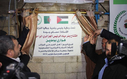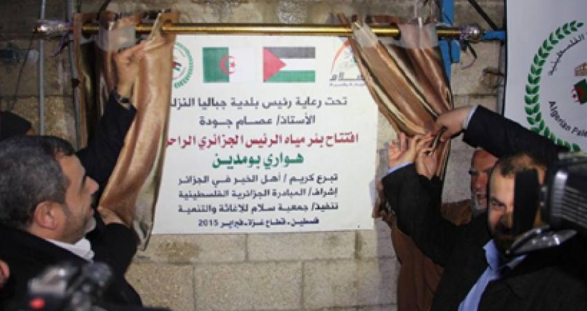 افتتحت جمعية سلام للإغاثة والتنمية بئر مياه الرئيس الجزائري الراحل "هواردى بومدين" بمنطقة أبراج المخابرات غرب مدينة غزة، بدعم وتمويل من المبادرة الجزائرية، وذلك للتخفيف من معاناة المواطنين من قلة المياه الصالحة للشرب. وحضر حفل الافتتاح كلاً من النائب د.محمد شهاب , أ.عصام جودة رئيس بلدية جباليا , أ.يعقوب سليمان رئيس جمعية سلام , أ.عمر سعد مسؤول المبادرة الجزائرية الفلسطينية بغزة ولفيف من الشخصيات والوجهاء وأهالي الحي. وقال د.محمد شهاب النائب في المجلس التشريعي د.محمد شهاب , أن قطاع غزة يعاني من أزمة خانقة في مياه الشرب نظراً لزيادة نسبة تلوثها، وذلك بفعل الحروب التي شنها الاحتلال الإسرائيلي علي القطاع. وأكد شهاب أن الشعب الجزائري قدم العديد من المساعدات للشعب الفلسطيني لاسيما أثناء العدوان الأخير علي قطاع غزة، مضيفاً أن هذه المساعدات تعزز من صمود شعبنا في مواجه الاحتلال الإسرائيلي. من جانبه أشار أ. عصام جودة رئيس بلدية جباليا النزلة, أن البلدية تسعي دائماً إلى التخفيف من معاناة المواطنين في ظل ضعف الإمكانيات المتاحة للبلدية بفعل الحصار المفروض علي قطاع غزة. ونوه جودة أن إنشاء هذا البئر جاء تلبيةً للحاجة الماسة لسكان هذا الحي والذي يواجه العديد من الصعوبات أثناء فصل الصيف من قلة المياه المتوفرة . بدوره أشار أ.عمر سعد مسؤول المبادة الجزائرية الفلسطينية , أن افتتاح بئر رئيس دولة الجزائر الراحل "هواري بومدين"، يأتي في أطار المشاريع الإغاثية والتنموية التي تقدمها المبادرة الجزائرية لأبناء شعبنا بقطاع غزة. وأردف سعد أن هذا البئر هو الثاني من نوعه تنفذه المبادرة الجزائرية وبإشراف جمعية سلام للإغاثة والتنمية. وشكر سعد كل من ساهم في إنشاء هذا البئر وعلي وجه الخصوص، المبادرة الجزائرية ممثلة برئيسها أبوأسامة الجزائري والشعب الجزائري علي دعهم ووقوفهم بجانب شعبنا المحاصر بغزة.
