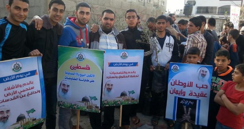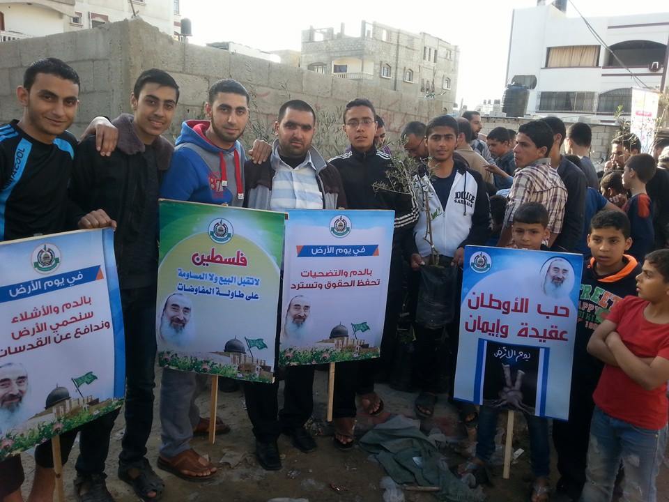 نظمت حركة حماس بمخيم جباليا شمال قطاع غزة، حملة تنظيف وزراعة أشجار الزيتون في المخيم بذكري يوم الأرض. وشارك في الحملة التي انطلقت مساء اليوم الاثنين، العشرات من أنصار الحركة، حيث تم زراعة 120 شجرة زيتون في شوارع منطقة تل الزعتر بالمخيم. وقال القيادي في الحركة حسن حمودة إن الحملة تأتي للتأكيد على التمسك بأرضنا، و بحق العودة. وأضاف أن الحملة تأتي أيضاً من منطلق التواصل مع المواطنين وضمن العمل التطوعي للحركة.