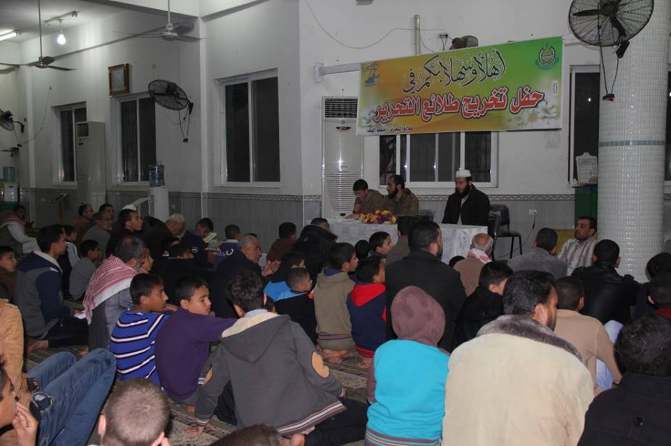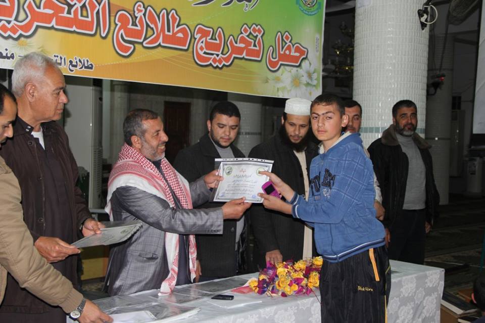 كرمت حركة حماس بمسجد البلد القديم في دير البلح، وسط قطاع غزة، اليوم الجمعة، طلاب مخيمات طلائع التحرير، التي عُقدت مؤخراً وشارك فيها قرابة الـ 100 طالبا. و أشاد إمام المسجد "محمد الحتو" بالقائمين على مخيمات طلائع التحرير، مبيناً أهميتها في تنشئة جيل قرآني مجاهد. وحثَّ في كلمته الآباء على تسجيل أبنائهم في مثل هذه المخيمات, مضيفاً أن طلائع التحرير تزرع روح المقاومة والدفاع عن الوطن. وتخلل الحفل عرض L.C.D لتدريبات الطلاب في مخيمات الطلائع، ووزعت أسرة المسجد الشهادات التقديرية عليهم. [img=042015/view_1428077615.jpg]ضع تعليق الصورة هنا[/img] [img=042015/view_1428077640.jpg]ضع تعليق الصورة هنا[/img] [img=042015/view_1428077648.jpg]ضع تعليق الصورة هنا[/img] [img=042015/view_1428077671.jpg]ضع تعليق الصورة هنا[/img]