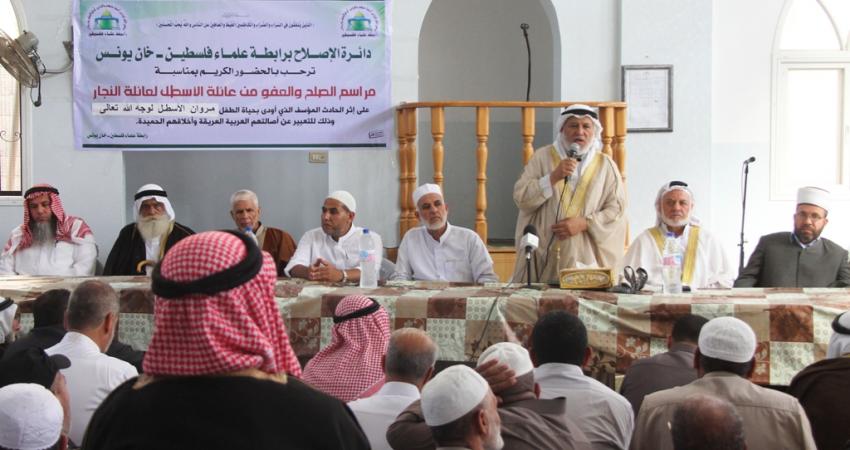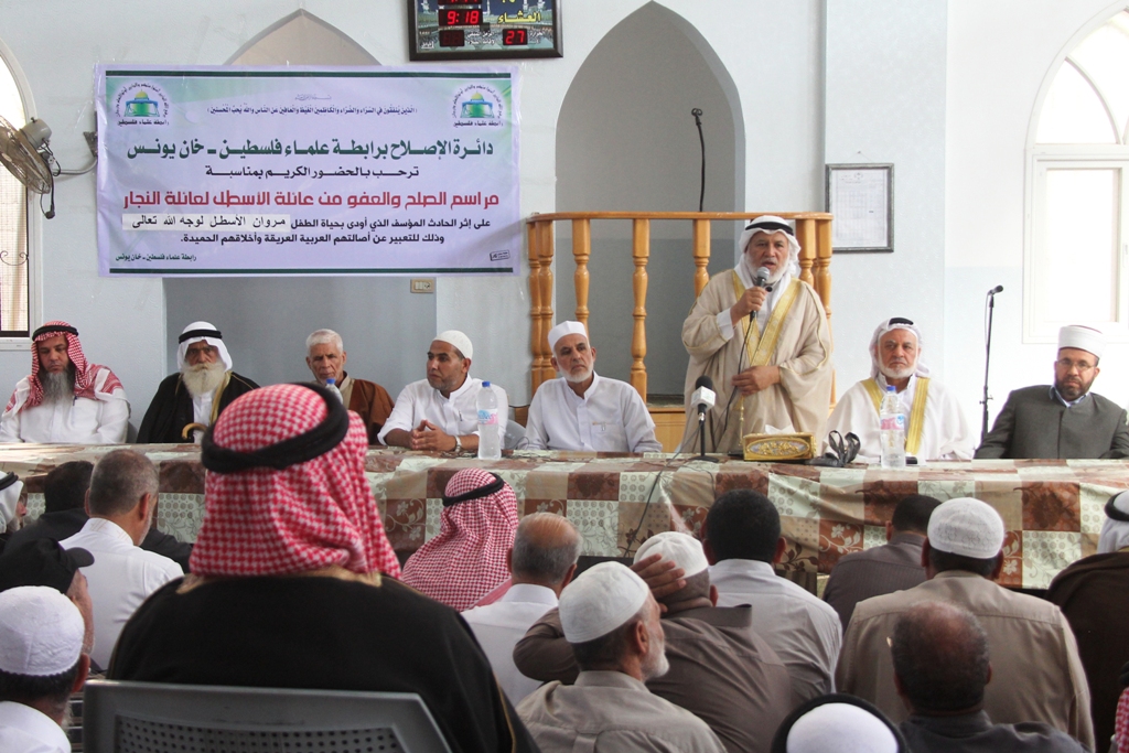 عقدت رابطة علماء فلسطين اليوم الأحد، مهرجان الصلح والعفو بين عائلتي الأسطل والنجار بمحافظة خانيونس، وذلك على إثر الحادث المؤسف الذي أودى بحياة الطفل مروان الأسطل. وحضر مراسم الصلح رئيس الرابطة النائب د. مروان أبو راس، ورئيس دائرة الإصلاح النائب د. سالم سلامة، ورئيس فرع الرابطة بمحافظة خان يونس أ. محمد الفرا، وعضوي الرابطة النائب د. يونس الأسطل، و د. إبراهيم النجار، والشيخ طارق الأسطل مدير لجان إصلاح محافظة خان يونس، وجمع كبير من المخاتير والوجهاء ورجال الإصلاح. وتحدث أبو راس عن فضل الإصلاح عن الله، ثم ذكر قوله تعالى: {لاَّ خَيْرَ فِي كَثِيرٍ مِّن نَّجْوَاهُمْ إِلاَّ مَنْ أَمَرَ بِصَدَقَةٍ أَوْ مَعْرُوفٍ أَوْ إِصْلاَحٍ بَيْنَ النَّاسِ وَمَن يَفْعَلْ ذَلِكَ ابْتَغَاء مَرْضَاتِ اللّهِ فَسَوْفَ نُؤْتِيهِ أَجْراً عَظِيماً، وَمَن يُشَاقِقِ الرَّسُولَ مِن بَعْدِ مَا تَبَيَّنَ لَهُ الْهُدَى وَيَتَّبِعْ غَيْرَ سَبِيلِ الْمُؤْمِنِينَ نُوَلِّهِ مَا تَوَلَّى وَنُصْلِهِ جَهَنَّمَ وَسَاءتْ مَصِيراً}. وتحدث معلقاً على هذه الآية: " إن التناجي يجب أن يكون في مجالات الخير، ولا يجوز أن يكون التناجي بالشر، ولذلك ذَكَّر ربنا سبحانه وتعالى بأنه يجب على المسلم أن يتبع النبي صلى الله عليه وسلم، وأن يسلك سبيل المؤمنين، ولا يجوز أن نخرج عن هذا السبيل، وسبيل المؤمنين هو في طاعة الله عز وجل، وتحكيم شرعه، ونحن في رابطة علماء فلسطين لا نقضي إلا بما شرَّع الله تبارك وتعالى في كل القضايا التي تصل إلينا ". ونوه إلى أحكام شريعتنا الغراء التي من أبرزها التراضي والتصافح بين المسلمين الذي هو أرقى أنواع القضاء، وأكد بقوله : "نحن كل هدفنا في لجان الإصلاح أن نجمع الناس على محبة وعلى القلب الواحد". وشكر رجال الإصلاح ورئيس الدائرة سالم سلامة على جهودهم المتواصلة في لجان الإصلاح. وفي نهاية كلمته تقدم بالشكر لعائلة الأسطل لصفحهم وتسامحهم وثمن موقفهم الكريم. وفي كلمتين منفصلتين للعائلتين المتصالحتين شكروا جهود لجان الإصلاح التي بذلت بشكل متواصل من أجل الإصلاح والتوفيق بينهم. وفي نهاية مهرجان الصلح تلا سلامة سند المصالحة والعفو بين العائلتين، وشكر جهود لجان الإصلاح التي بذلت للإصلاح بين العائلتين.