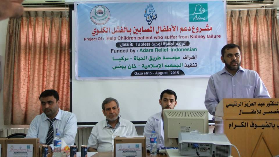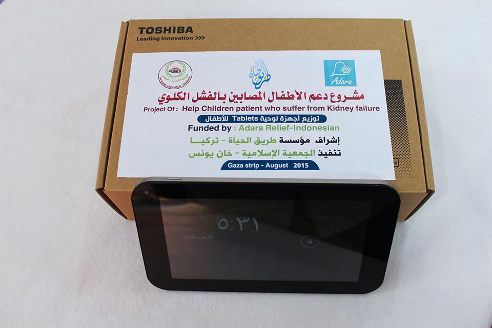 في لمسة انسانية بامتياز ,شرعت الجمعية الإسلامية فرع خان يونس، اليوم بتوزيع  أجهزة لوحية تابلت Tablet على الأطفال المصابين بالفشل الكلوي،  وذلك بتمويل من مؤسسة( (Adara Reliefالإندونيسية وبإشراف مؤسسة طريق الحية -تركيا .